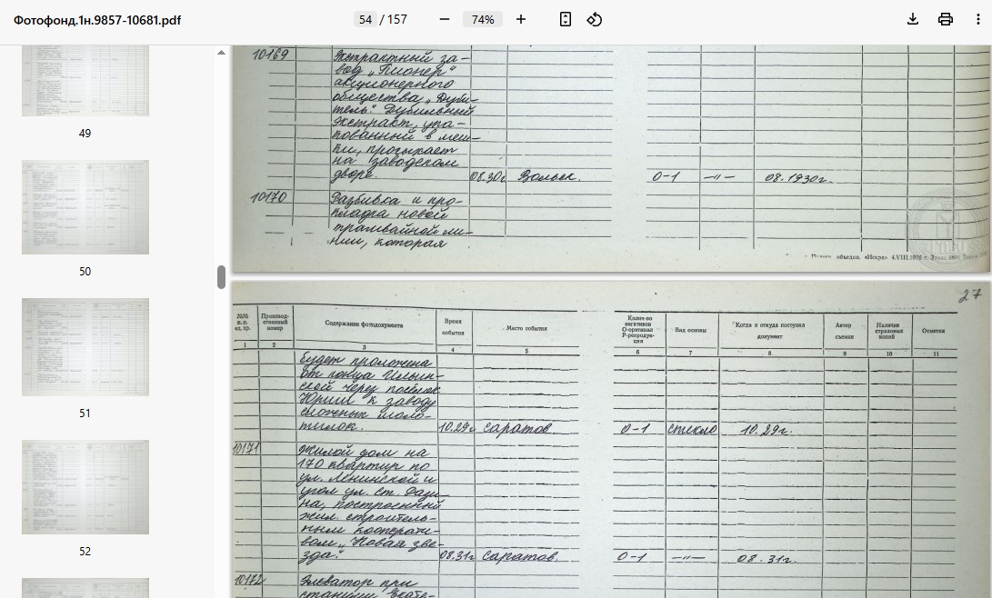 В описях фотофонда вычитала: Фотофонд.1н.9857-10681, ф.10170 "Разбивка и прокладка и новой трамвайной линии... к заводу молотилок"