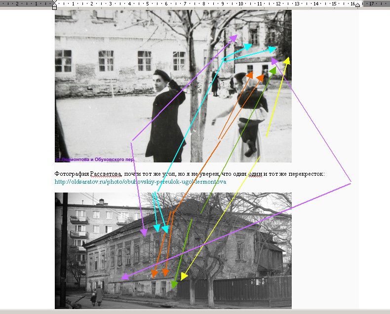 Уважаемый Станислав Гридасов! Может быть я не совсем верно понял фразу почти тот же угол, но я не уверен, что один один и тот же перекресток, но прилагаю файл, с отмеченными "похожестями" дома на двух фото. Похожие элементы отмечены стрелками разного цвета. А если это один и тот же дом, значит это и перекресток один и тот же. Только с иной точкой съемки. С уважением!