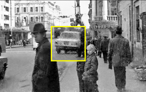 Предлагаю версию по определению даты съемки. Вдали, в увеличенном фрагменте в желтой рамке, угадывается автомобиль Запорожец ЗаЗ 966 или ЗаЗ 968. Большие круглые фонари узкий хромированный бампер. Но главное - задний автомобильный номер - ч