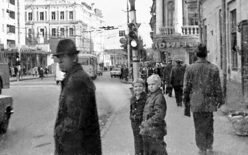 Предлагаю версию по определению даты съемки. Вдали, в увеличенном фрагменте в желтой рамке, угадывается автомобиль Запорожец ЗаЗ 966 или ЗаЗ 968. Большие круглые фонари узкий хромированный бампер. Но главное - задний автомобильный номер - ч ерный фон с белыми символами квадратной формы. Прилагаю.
