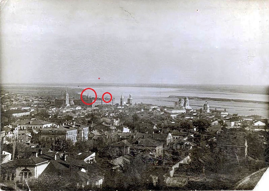 Согласен. Место колокольни Александро-Невского собора и место Казанской церкви на аэрофотосъёмке определяется чётко, и церковь должна быть видна именно там, где Вы указали. Присмотритесь: справа от колокольни что-то белеет. Возможно, это недоломаная церковь.