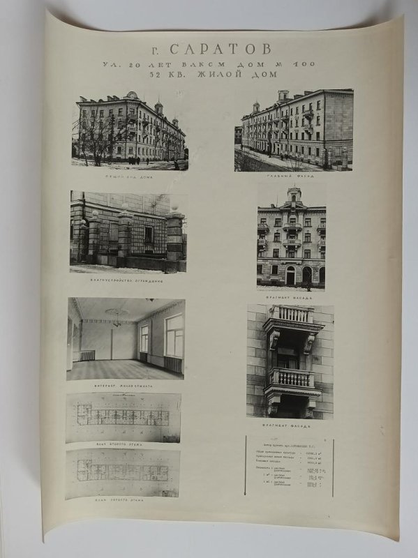 Жилой дом на 52 квартиры в г. Саратов. Планы этажей, общий вид, фрагменты фасада, ограждение и пояснительная записка. Из комплекта «Всероссийский конкурс на лучшие жилые и гражданские здания, построенные в городах и рабочих поселках РСФСР в 1953 г.». Архитектор: Ботяновский Т.Г.