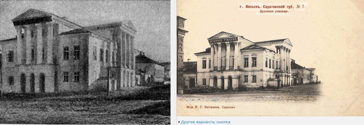 Первое здание Вольского Духовного училища находится напротив Меркульевской мельницы через Комсомольскую улицу.