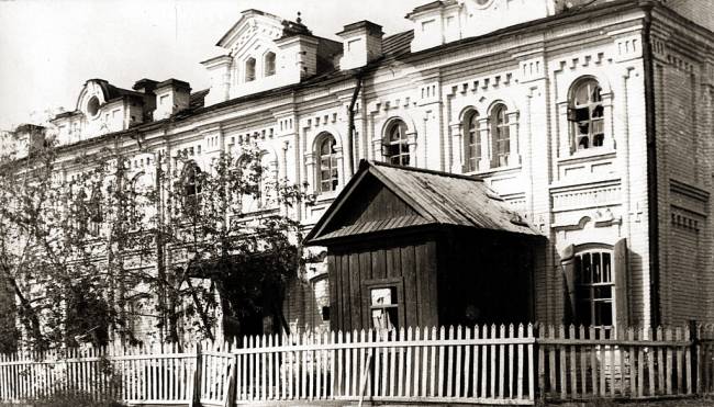 Студенты ХМТ на субботнике у главного входа в общежитие техникума. Вид на здания бывшей Общественой больницы и родильного приюта Покровского сельского общества. (здания утрачены). Фото Николая Крупнова