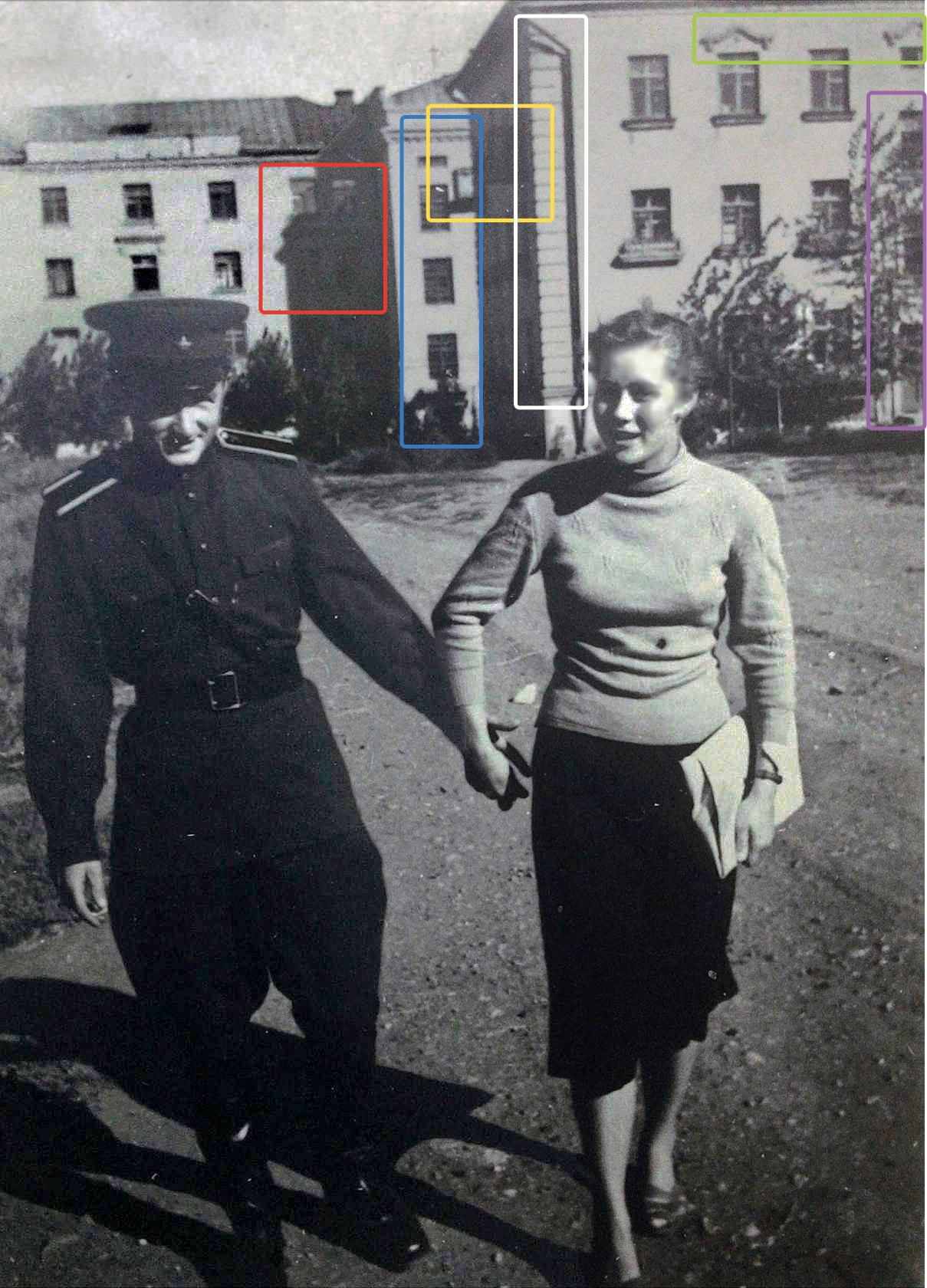 Красный цвет - сдвоенные окна у торца дальнего здания