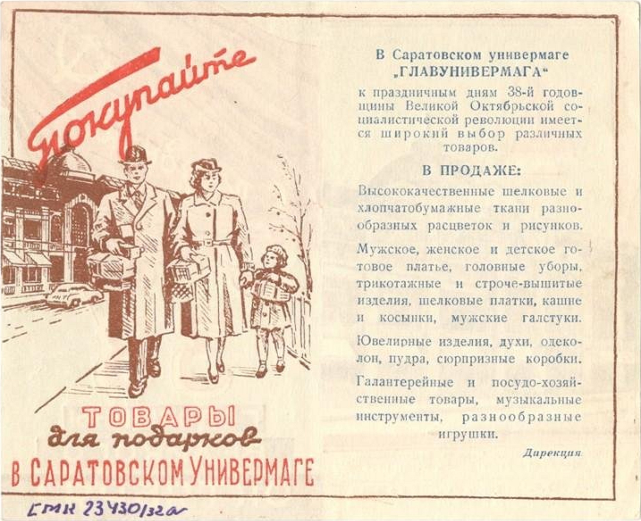 Листовка рекламная Саратовского универмага о всевозможном выборе новогодних подарков на 1951 г.