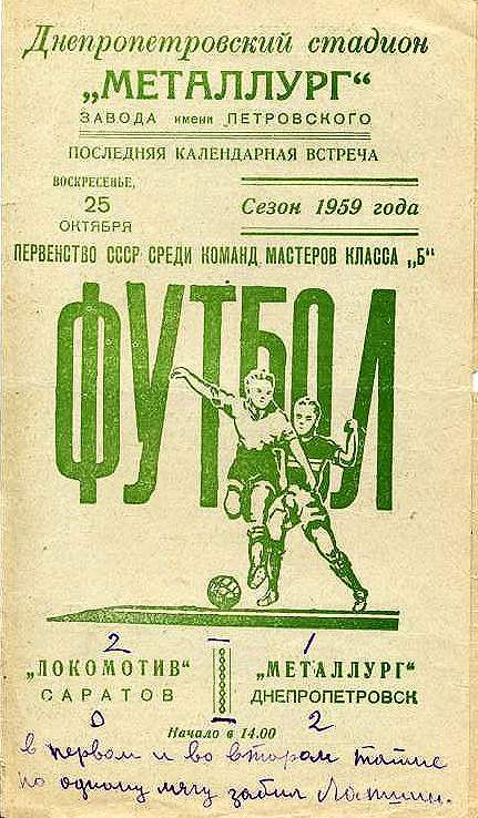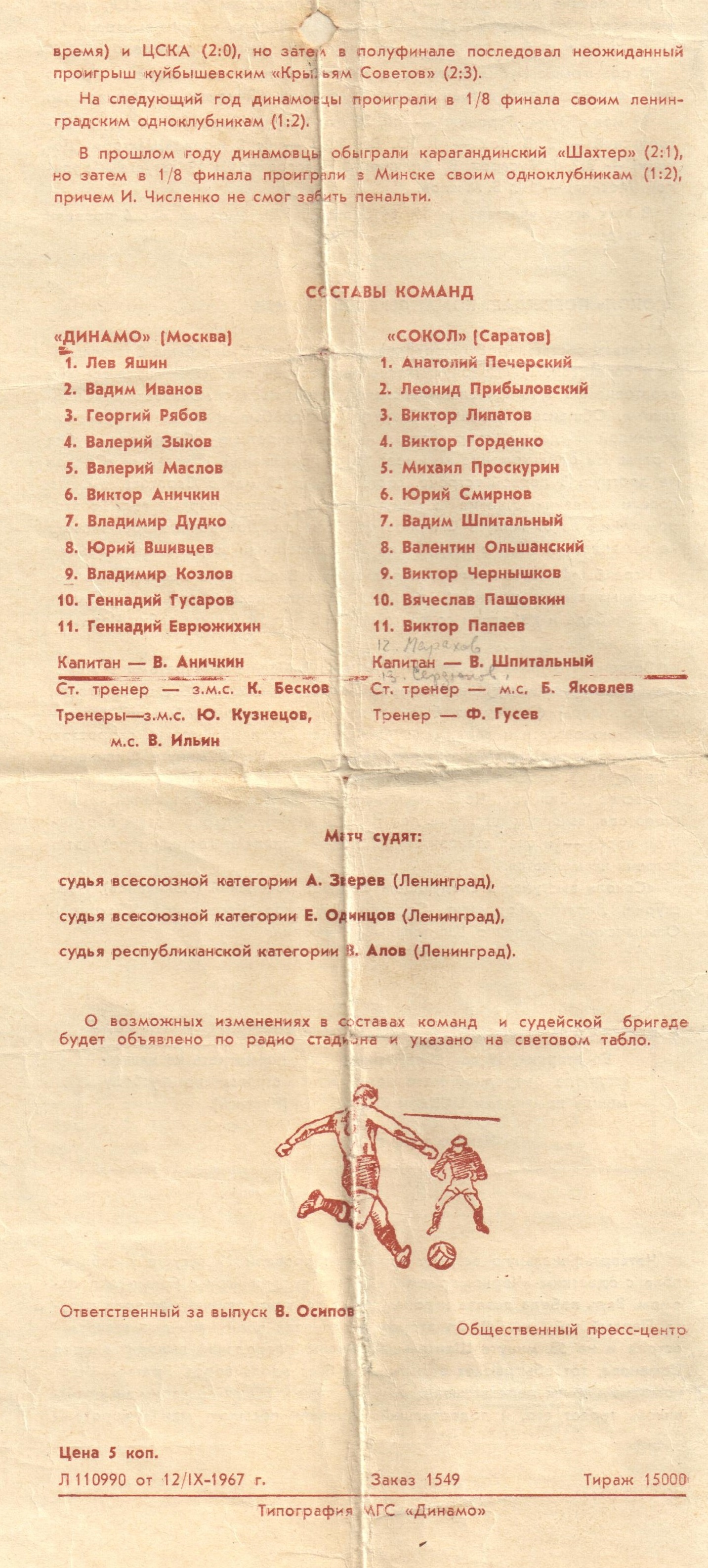Уважаемый Dextra, если есть оригинал и с ним не жалко расстаться во имя развития муз 10.30ея истории Саратовского футбола, приносите в воскресенье на стадион "Локомотив" (сев.трибуна) в 10.30. Всё примем по правилам музеёного дела, а Вше имя. как дарителя, будет отражено в специальном стенде. Пока их, стендов, -только два. Копии этой программки. как и всех кубковых 1967 года, у нас есть. Но коллекционеры не спешат расставаться с оригиналами, пока не спешат. Ждут! Все ждут, что у нас получится или не получится. Получится!!!