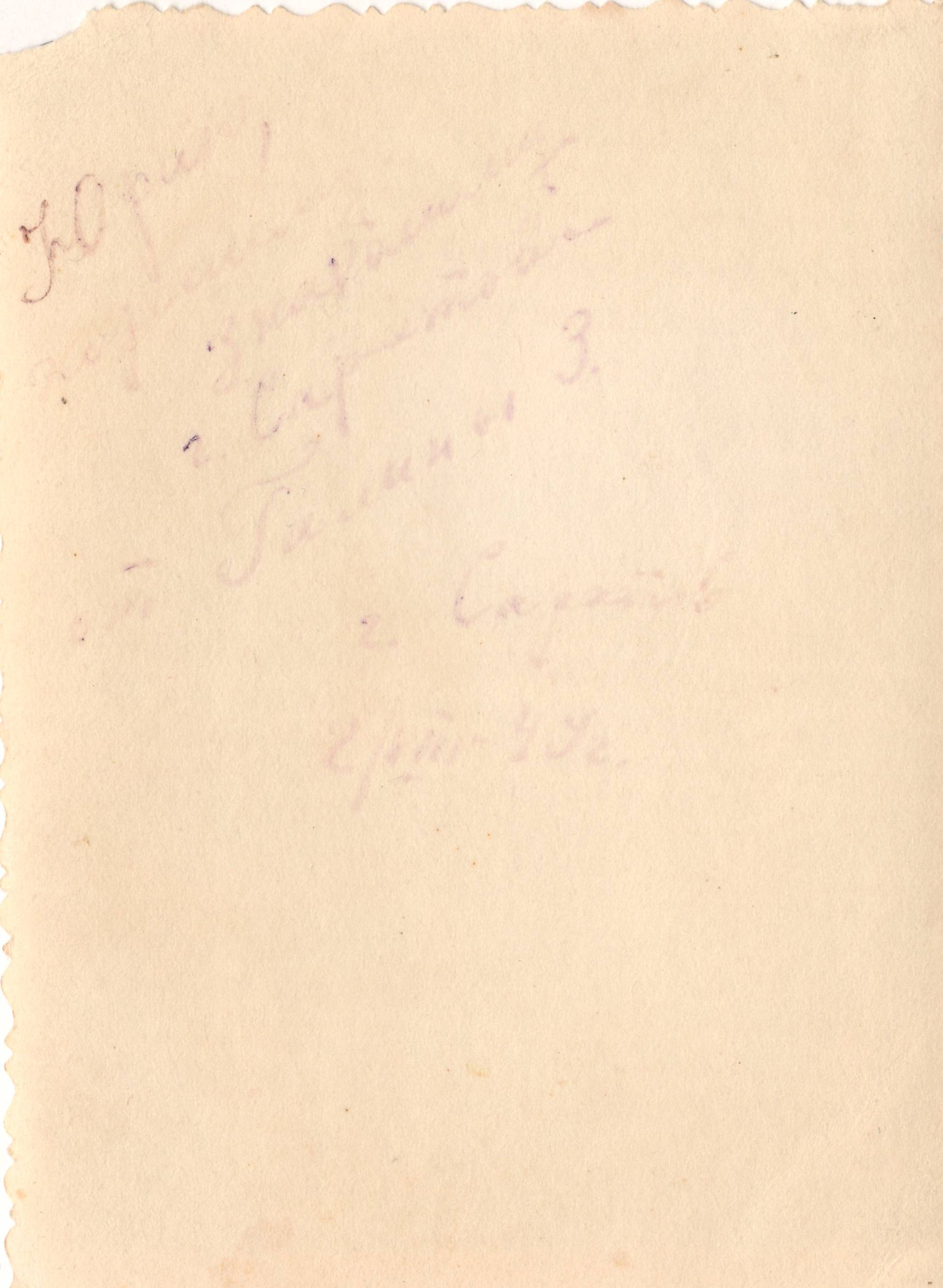 14 июля 1941 года, город Саратов, сидят сёстры-близнецы Фёдоровы Ольга Ивановна и Антонина Ивановна (обе – воспитанники детского дома), в центре – Елизавета Плугина