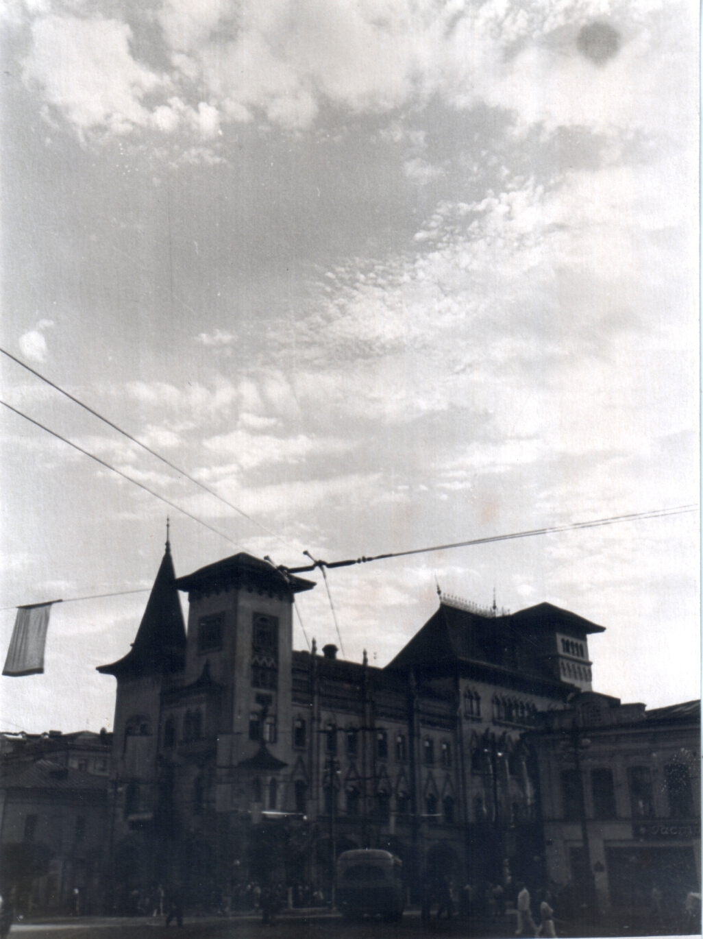 В 1957 году на опоре на углу перед гастрономом смонтировли стенд (на снимке).