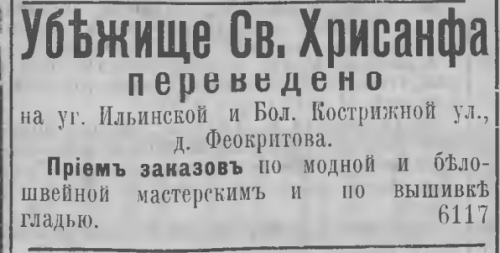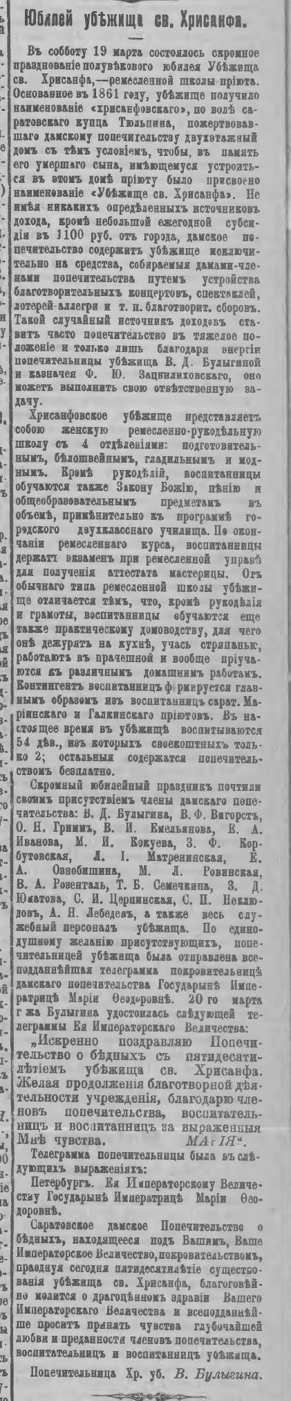 Въ субботу 19 марта состоялось скромное празднованіе полувѣкового юбилея Убѣжища св. Хрисанфа,— ремесленной школы пріюта. Основанное 1861 году, убѣжище получило наименованіе «хрисанфовскаго», по волѣ саратовскаго купца Тюдьпина, пожертвовавшаго дамскому попечительству двухэтажный домъ съ тѣмъ условіемъ, чтобы, въ память его умершаго сына, имѣющемуся устроиться въ этомъ домѣ пріюту было прясвоено наименованіе «Убѣжеще св. Хрисанфа»...