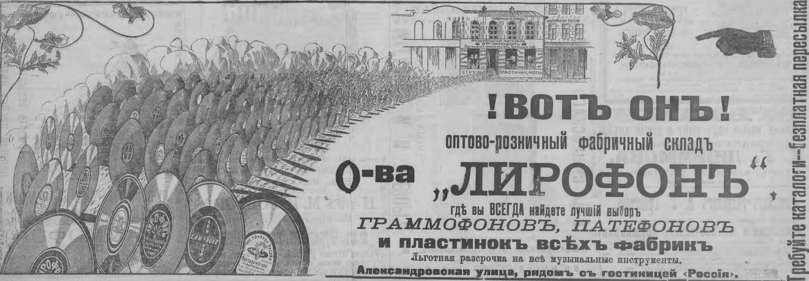 На Александровской улице против гостиницы «Россия» прохожих привлекает искусно разбитый вдоль тротуара газон, служащий рекламой помещающегося напротив музыкального магазина «Лирофон». По зелени сделана надпись: с одной стороны «музыка», а с другой литеры «М.М.Т.Л.».