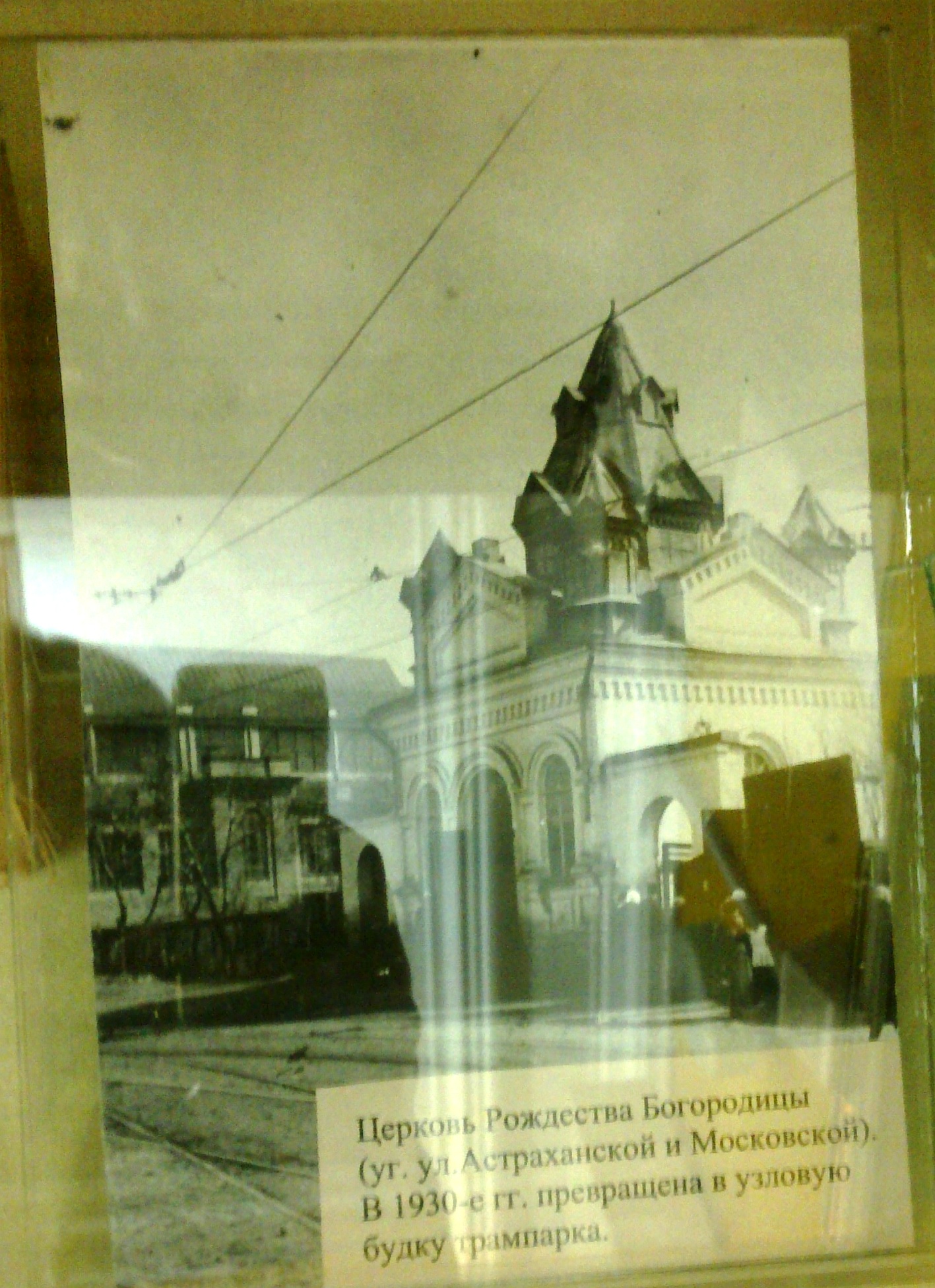 Дату нижнюю приблизительно. Крестов нет. Значит это уже трампарк. Верхняя-скорее всего до войны. С точкой тоже не уверен. Может это та узловая будка трампарка, которыя была напротив. Тогда с поворотм рельсов несостыковка. Была же у нас версия, что было два трампарка. Про эту церковь может быть можно поискать в книге Малинина, посвящённую саратовским церквям или в других источниках. Тег "Церковь Рождества Богородицы" поставил, но у нас под этим тегом Никольская церковь. Словом больше вопросов, чем ответов. Помогайте, кто что знает. Или в музее ошиблись? Я честно искал эту церковь по различному сочетанию тегов-Улица Московсакя,Улица Астраханская,Храмы Саратова. Не нашёл. Добавил. Пожалуйста обработайте фото, если такого нет на сайте. За качество фото извините. Чем богаты. И что за здание на заднем плане?