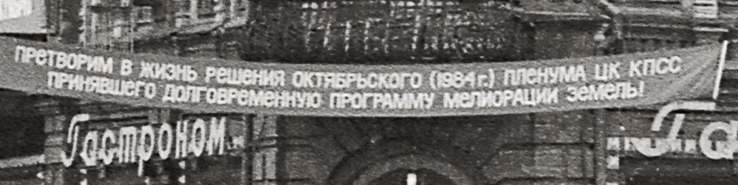 На растяжке: Претворим в жизнь решения октябрьского (1984 г.) пленума ЦК КПСС..... Это 1984 год.