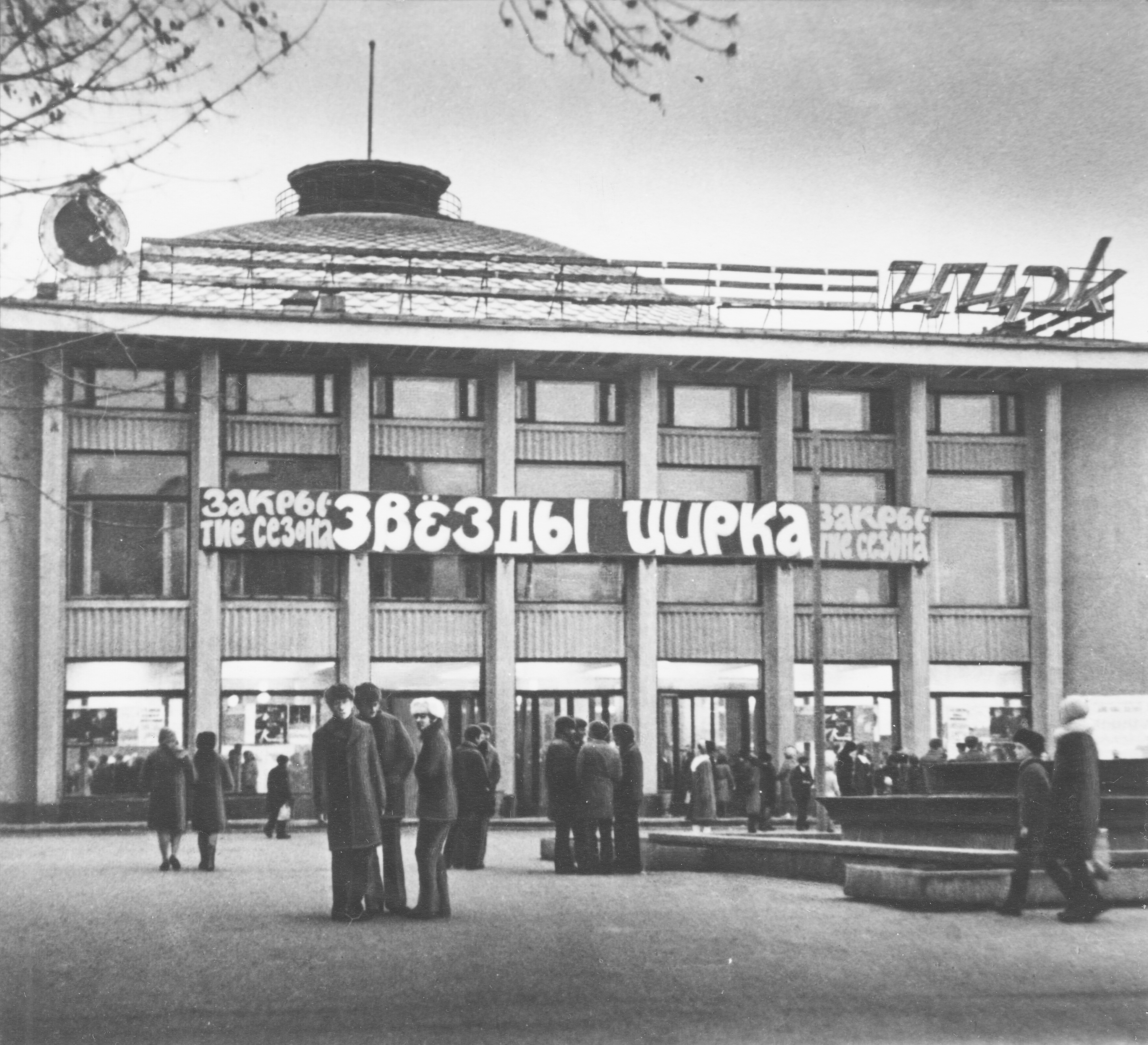 Снимок сделан весной 1973 перед окончанием сезона. На фотографиях 1972 года еще нет опоры с группой светильников между фонтаном и фасадом. На снимке опора уже установлена, но еще без светильников, которые смонтируют позже.