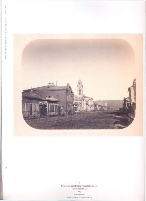 вот, кстати об этом фото:"В 1863 году фотографом Муренко была сделана фотография, изображающая часть Немецкой улицы в квартале междуНикольской (ныне ул. Радищева) и Александровской (ул. Горького): булыжная мостовая, пустынные тротуары, одноэтажные строения, башенки деревянного католического костёла. На одном из домов различима вывеска “Зеркальная фабрика Мейстера”. Ныне примерно на этом месте — бывший дом Дружинина, где испокон веков размещалась булочная. Сначала эго было отделение известной всероссийской хлебопекарной фирмы Филиппова, знаменитого московского булочника, а потом — магазин при фабрике Стружкина, где продавалась всегда свежая и вкусная, в традициях Саратова, хлебная продукция."