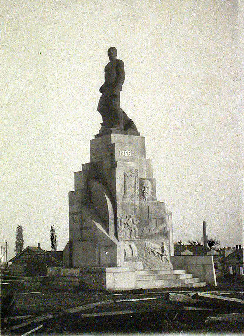 В доп. - фигура рабочего, ещё не установленная на постамент, и фотография скульптора Б.Королёва (она же - удостоверение личности с печатью профсоюза работников искусств).