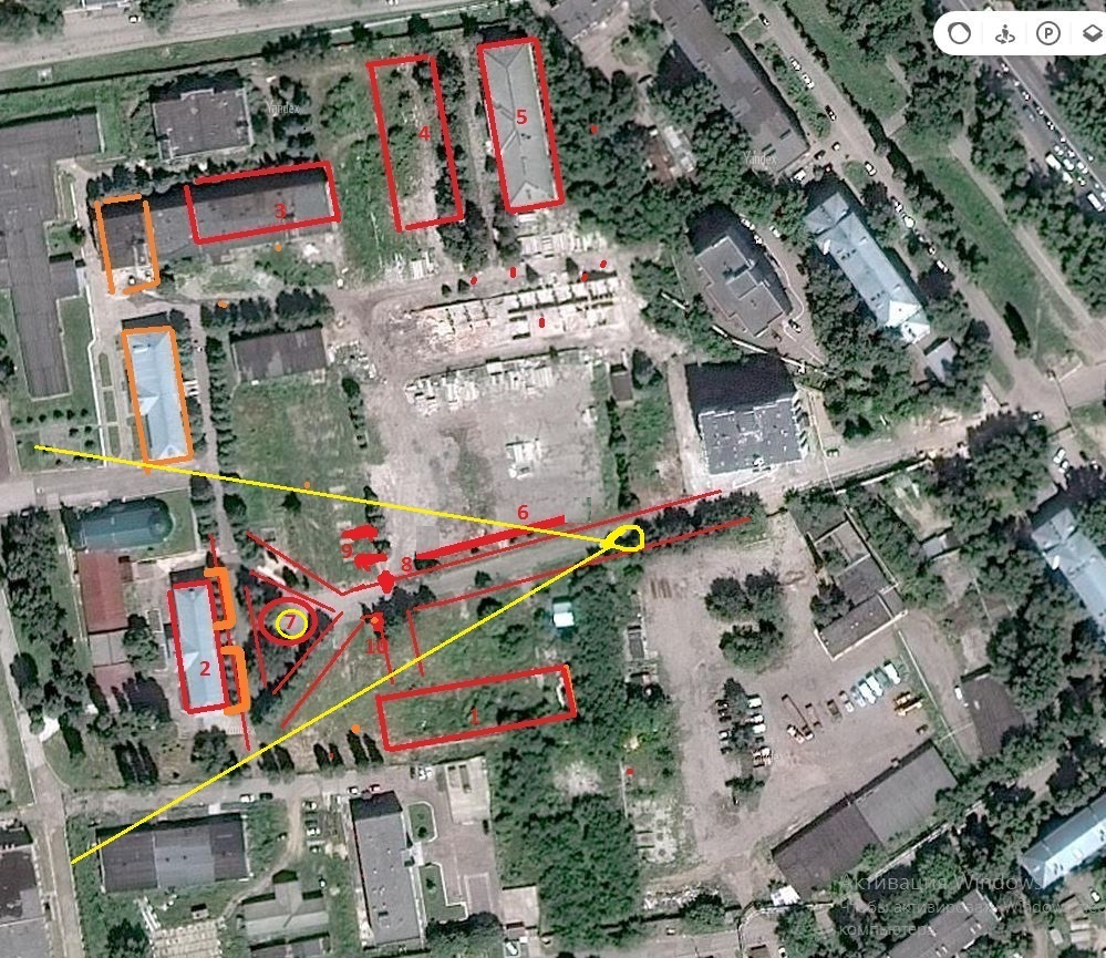 Желтым обозначена точка, откуда сделана первая из серии фотографий. Тонкими желтыми линиями обозначен сектор обзора. Красными цифрами обозначены объекты, которые видны (красные контуры зданий) или не видны (оранжевые контуры зданий) на этих фотографиях.