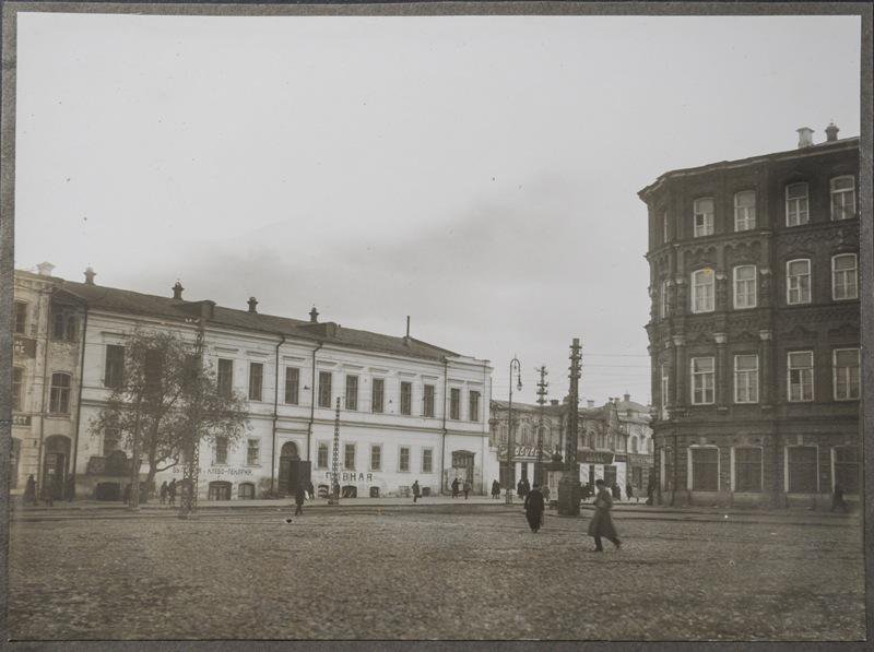 Угол улицы Никольской (ныне Радищева) и Театральной площади. Слева здания архиерейского двора с магазинами и пивной, справа – здание Саратовского института сельского хозяйства и мелиорации. Из альбома с фотографиями Бориса Харлампиевича Медведева, директора Саратовского института сельского хозяйства и мелиорации.