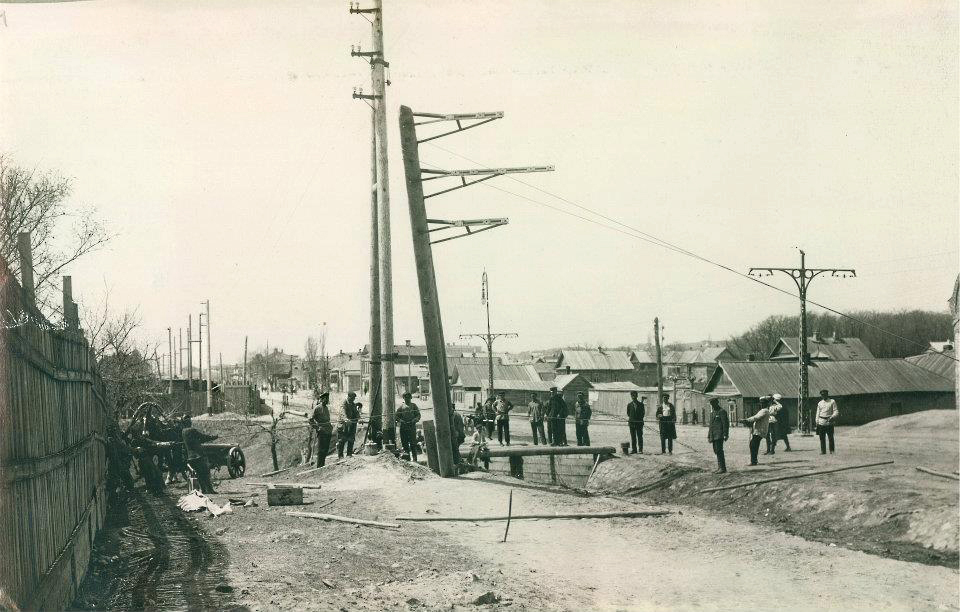 Заменил название снимка "Ул.Чернышевского. Замена опор электросети?" на "Строительство высоковольтной (6000 В) воздушной ЛЭП". Строят ЛЭП на деревянных одноцепных опорах для передачи электроэнергии от СарГРЭС, поэтому время съемки ближе к окончанию строительства СарГРЭС, а пока указано время съемки начала строительства - 1924-1926 г.. Для специалистов представляет интерес установка штырей изоляторов на траверсе, так как до последнего времени было принято на деревянных опорах высоковольтных ЛЭП применять крюки (как к насосной станции за Глебучев овраг) . В жилой зоне обязательно двойное крепление проводов. На одном изоляторе крепится провод, на втором - дополнительный провод, концы которого зажимаются на основном проводе. Поэтому мы видим по паре изоляторов на траверсе.