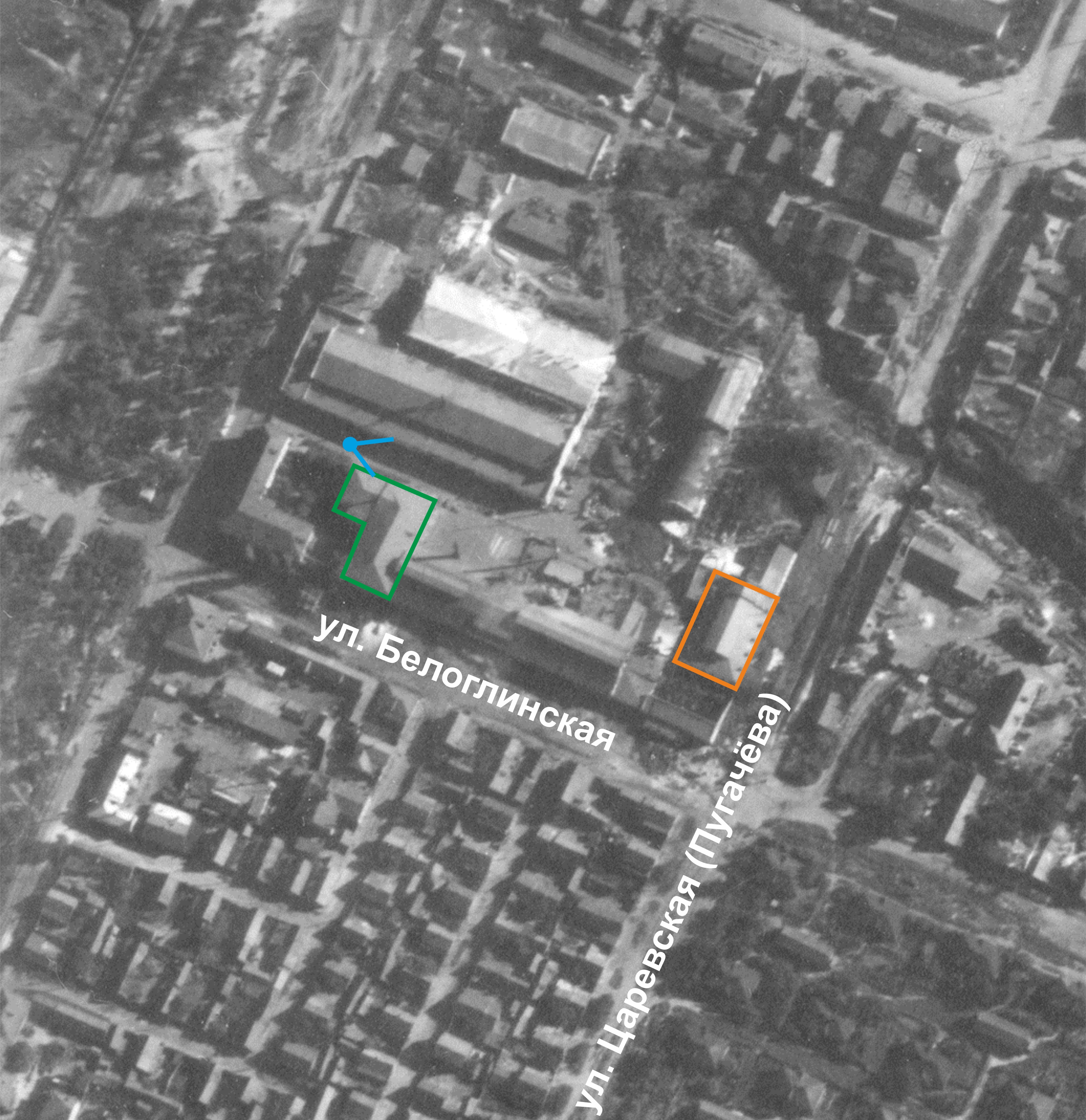 Так же эту гипотезу я строю на том, что на заднем плане видно здание с характерной двухуровневой крышей, которое я выделел оранжевым цветом.