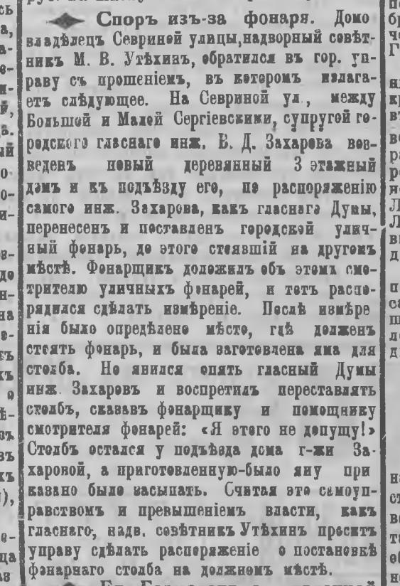 Домовладелец Севриной улицы, надворный советник М. В. Утехин, обратился в гор. управу с прошением, в котором излагает следующее. На Севриной ул., между Большой и Малой Сергиевскими, супругой городского гласного инж. В, Д. Захарова возведен новый деревянный 3 этажный дом и к подъезду его, по распоряжению самого инж. Захарова, как гласного Думы, перенесен и поставлен городской уличный фонарь, до этого стоявший на другом месте. Фонарщик доложил об этом смотрителю уличных фонарей, и тот распорядился сделать измерение. После измерения было определено место, где должен стоять фонарь, и была изготовлена яма для столба, Но явился опять гласный Думы инж. Захаров и воспретил переставлять столб, сказав фонарщику и помощнику смотрителя фонарей: "Я этого не допущу!". Столб остался у подъезда дома г-жи Захаровой, а приготовленную - было яму приказано было засыпать. Считая это самоуправством и превышением власти, как гласного, надв. советник Утехин просит управу сдедать распоряжение о постановке фонарного столба на должном месте.