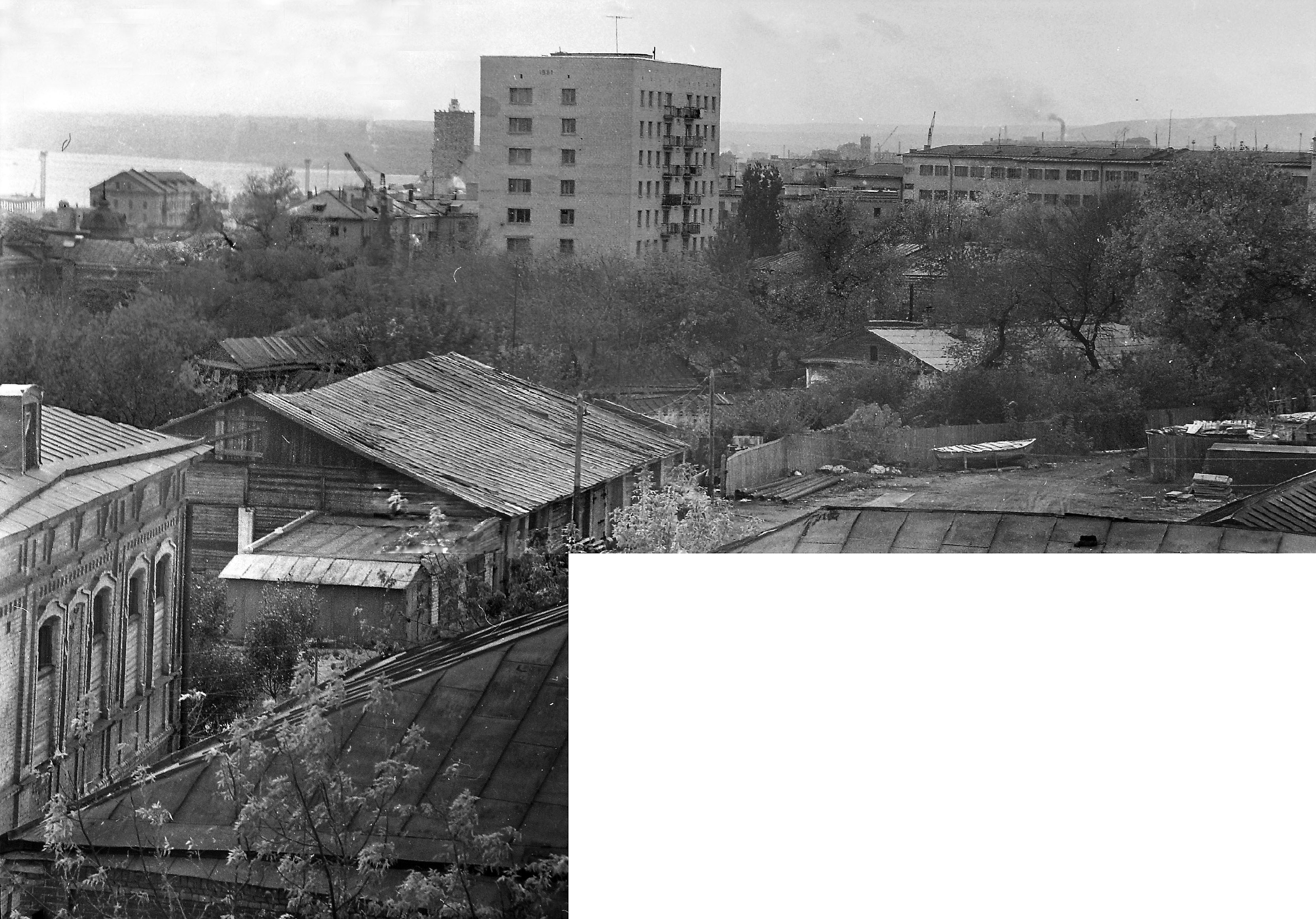 Поставил главной склейку с соседним. Предположу, что снимали с 5-этажки на Мичурина, 116а. На переднем плане крыша дома 157, к. 6 (квадратное здание в центре на аэрофотосъемке ниже), левее торец женского епархиального училища. За ними примерно так все и было, как на фото: