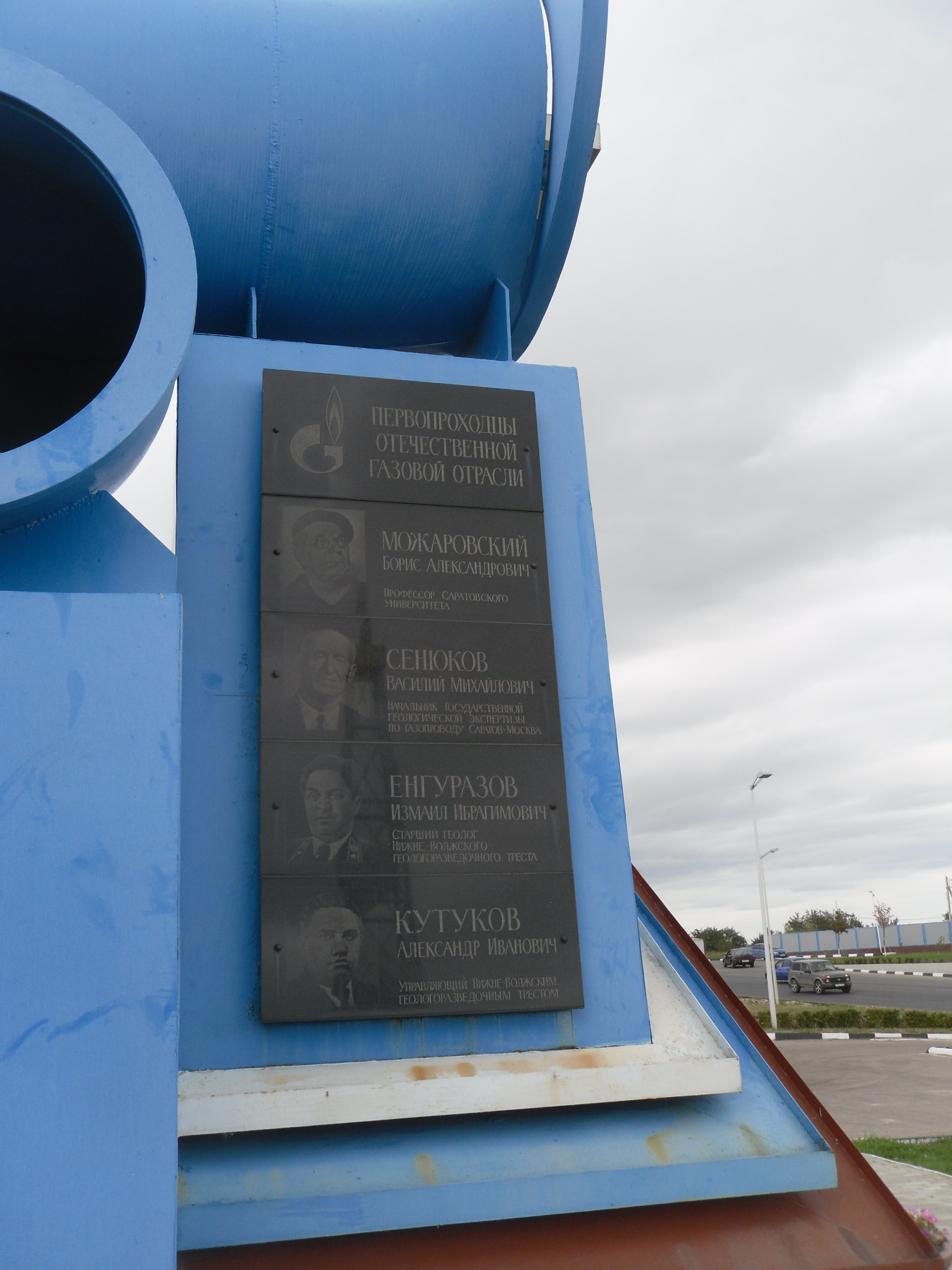 Позади вышки возвели стенку, на которой изображён маршрут газопровода "Саратов-Москва", а правее - конструкция, собранная из частей трубопровода, на которой укреплена памятная плита "Первопроходцы отечественной газовой отрасли"