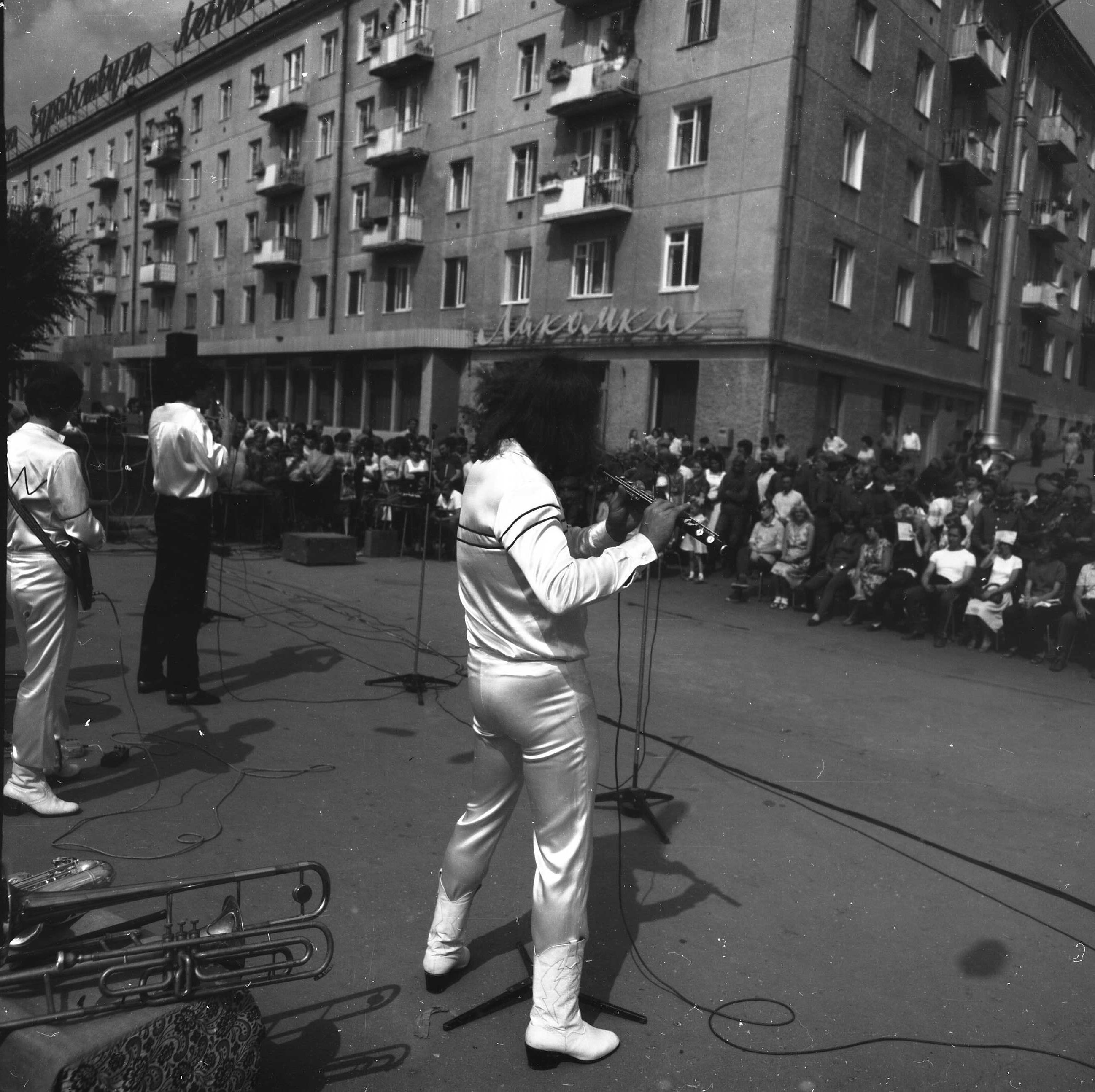 Это не фестиваль (Как-то несолидно для фестиваля). Выступление музыкантов (ВИА) в день ярмарки. Во время ярмарок были такие выступления, чаще на пл. Чернышевского. Уберите тэг "Курсанты"- это стройбат со строительства фонтанов и год 1984. С лета 1985 г. появились кафе-"колокольчики" (майский указ), в т. ч. и у "Лакомки", здесь их ещё нет. Не заметил: Зрители сидят на стульях из "Лакомки".