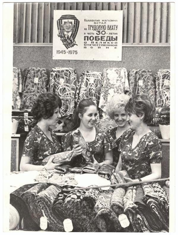 "Группа продавцов магазина «Чародейка» первого промторга г. Саратова, вставших на трудовую вахту в честь 30-летия Победы в Великой Отечественной войне". 1975 г., апрель .