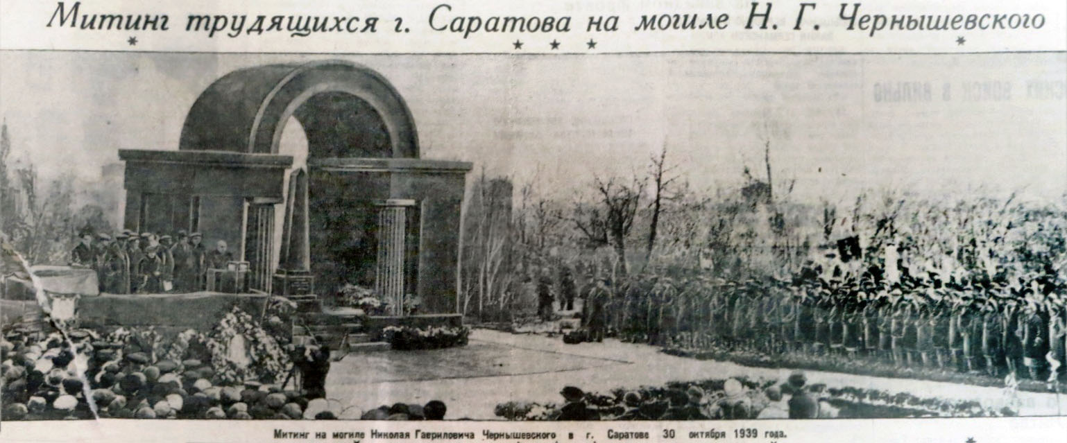 Памятник , украшенный цветами и венками и трибуна на открытии надгробного памятника Н.Г. Чернышевскому.30.10.1939 г. к 50-летию со дня смерти.