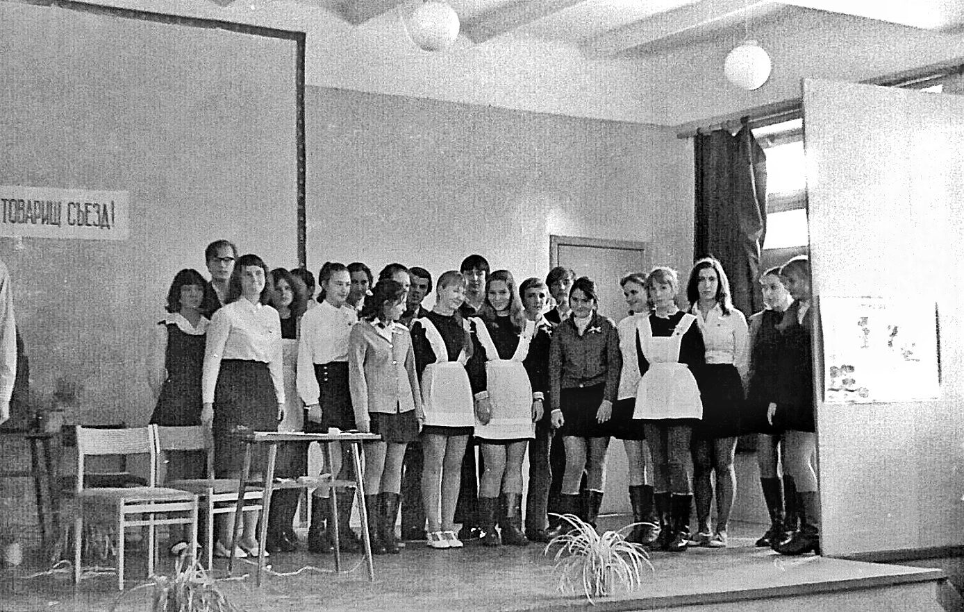 Предлагаю сравнить по фото, школьница в первом ряду слева Елена Ржихина, март 1976 г актовый зал 73 шк. Имхо похожие черты лица как у фигуристки с бантом из одноименного профиля ок. Если так, то на снимке около 1972-73гг