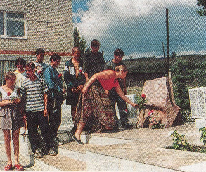В книге "Связаны одной судьбой" к данной фотографии дано такое описание: "Юное поколение Александровского округа (пос. Тепличный) чтит подвиг павших героев Великой Отечественной".