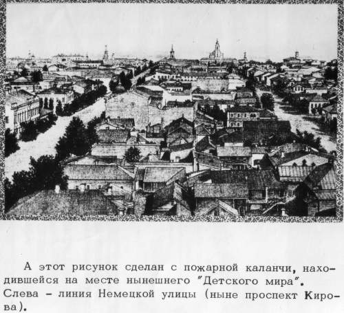 Возможно, фрагмент какой-то фотографии. Первоисточни мне не попадался. Снято, очевидо, с пожарной каланчи на углу Немецкой и Ильинской.