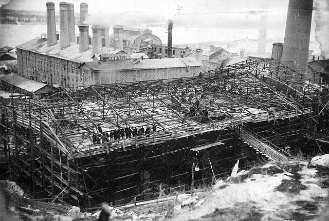 На фото строительство кровли на одном из цехов Глухоозерского цементного завода. Столько труб на заводе было в до революционное время.