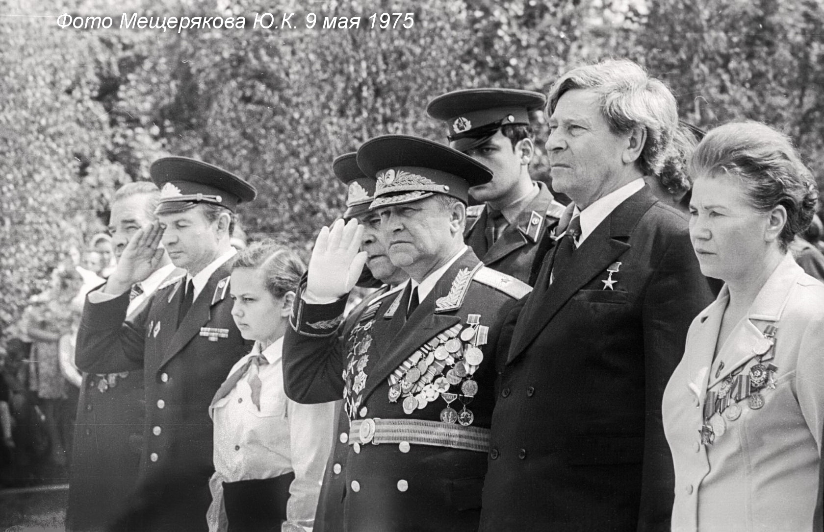 Фото из архива Мещерякова Юрия Константиновича. Съемка 9 мая 1975 года. Официальные лица - председатель городского Совета Киселев Василий Петрович и первый секретарь ГК КПСС Елисеева Анна Тимофеевна. На втором дополнительном высокий мужчина со звездой Героя социалистического труда - вольчанин, профессор Токин Борис Петрович, в честь которого в Вольске названа улица. За Токиным -генерал майор Горюн Владимир Федорович, начальник Вольского военного училища, участник Великой Отечественной войны, танкист. Девочка-пионерка - Мыльцева Света.