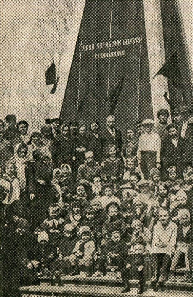 В канун 40-й годовщины Октябрьской революции 1917 года на братской могиле был установлен величественный монумент высотой 7,5 метра, представляющий собой трехфигурную композицию, венчающуюся знаменем. На лицевой грани пьедестала на мраморе золотом высечено: "Борцам социалистической революции 1917 года". Автор памятника – саратовский скульптор В. Перфилов.