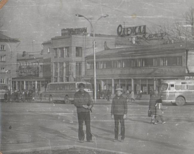 Площадь Орджоникидзе, 1, вид на остановку "Комбайн", где теперь располагается магазин радиоэлектроники